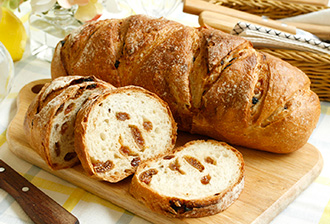フランスパン生地に、白イチジクと白ブドウを練り込み焼き上げた、ほんのりフルーティーなお食事パン。料理と合わせやすいよう、優しい風味に仕上げました。